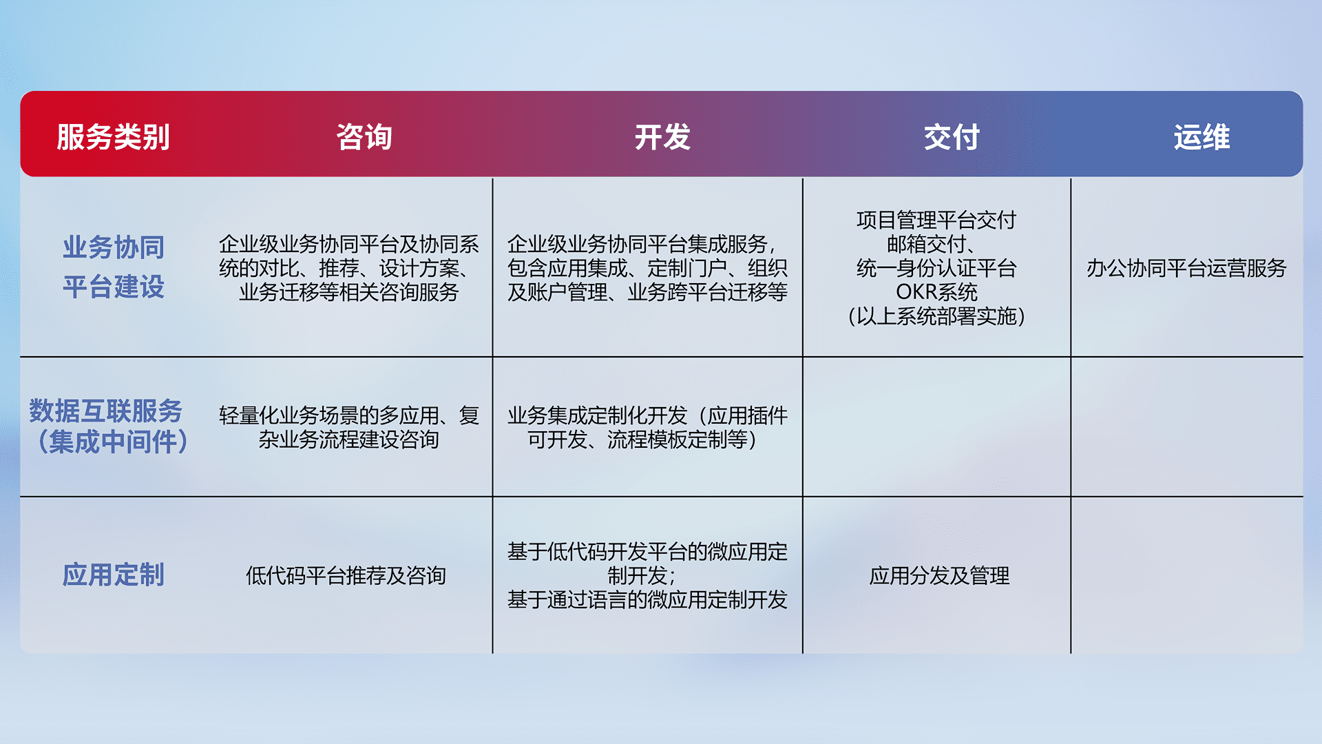 针对钉钉、、、、企微、、、IDaas等平台级产品提供产品的规划、、方案、、交付、、、、定制化开发等服务,,实现如统一协同办公、、智能客户服务、、、、混合会议管理、、、、智能数据查询、、、等业务场景,,,实现数字化转型。。